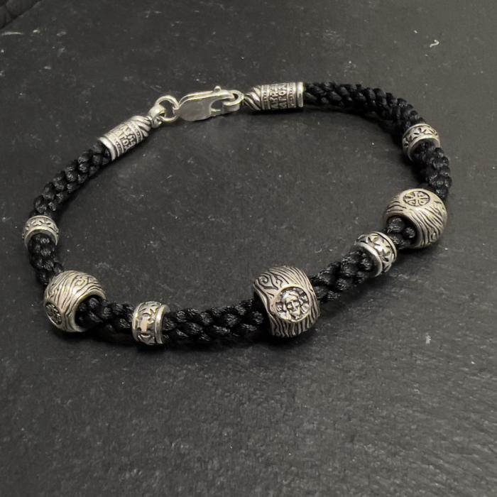 На браслете 7 насадок: 4 разделительные, они неподвижны, тем самым не дают другим бусинам скатываться в кучу. На центральной бусине Спас Нерукотворный, по бокам: Хризма, Голгофа. На концевиках и на каждой бусине так же молитва: "Господи помилуй мя"