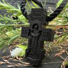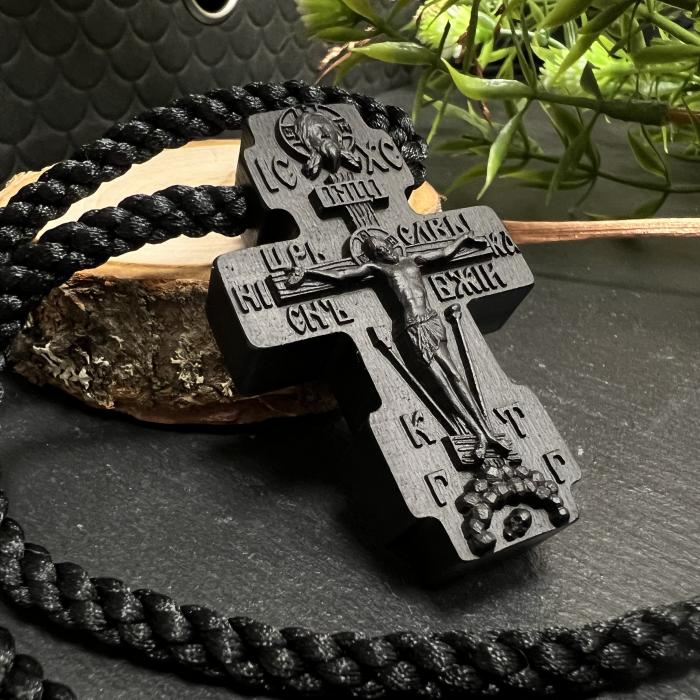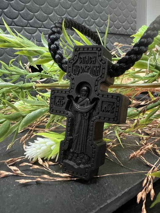 Крест нательный православный из чёрного дерева размером 55мм. В комплекте с крестом специальный шнур: диаметром 4мм и 65см в длину. Лицевую часть деревянного креста традиционно занимает распятие Спасителя. На оборотной стороне православного креста прорезан Покров Пресвятой Богородицы, а также молитва "Спаси и Сохрани". Крест резной вскрыт маслом. Масло изготовлено из 100% натуральных компонентов, обеспечивает защиту от влияния влаги.