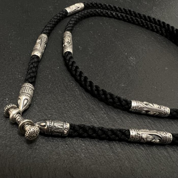 Шнурок для креста, крестика, подвески, православный, гайтан с серебряными вставками 925 пробы с чернением. На гайтане расположено 6 серебряных вставок с изображением 12 Апостолов и серебряный замок переходник. Шнурок ручной работы толщиной 4,5мм изготовлен из высококачественного полиэфирного шёлка. Он не окрашивает, не выцветает, гипоаллергенный, не деформируется и не ворсится. На серебряных оконцевателях изображена "Иисусова молитва". Гайтан не боится воды.