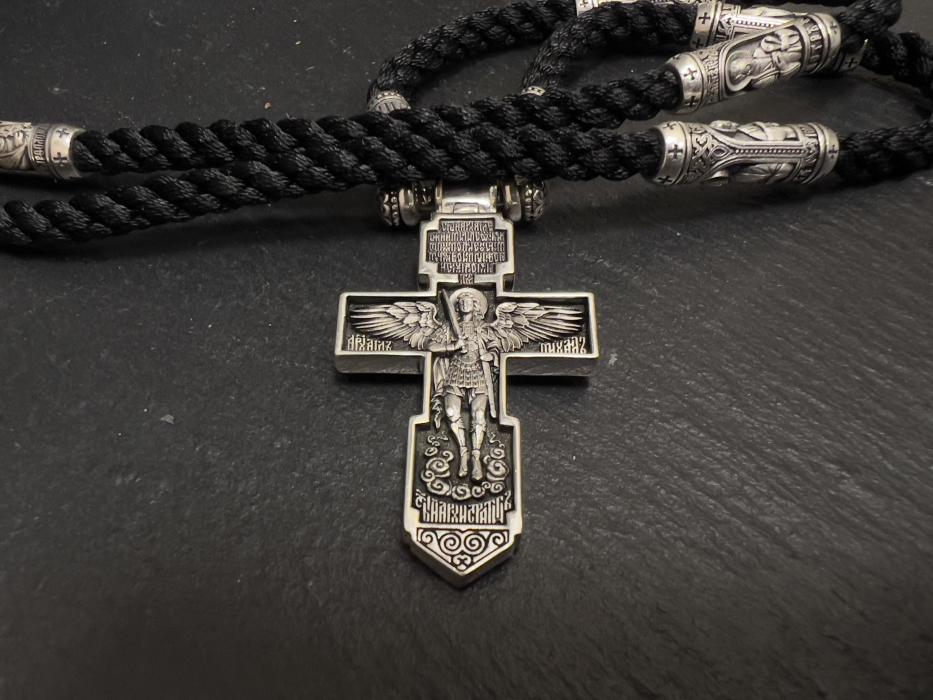 Крест Архангел Михаил. Гайтан 12 апостолов Длина гайтана: 65см, 70 см Толщина шнура 4,5мм Размер креста: 45мм х 22мм Weight: 29 грMetal: Silver 925° Артикул: 1510_20Kompl Price: 348.00 €
