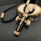 На лицевой стороне креста изображена икона Иисуса Христа, где Он представлен в образе Господа Вседержителя, то есть всемогущего Бога, держащего в руках Книгу Судеб всего человечества. С двух сторон Ему предстоят в деисусе (молении за людей) Пресвятая Богородица и пророк Иоанн Предтеча, Креститель Господень. Вверху и внизу изображены архангелы Михаил и Гавриил. По периметру креста слова из Ветхого Завета: "Господа, пойте и превозносите Его во веки.". На ухе креста молитва: «Милосерде Господи, спаси и помилуй мя». На обороте — Валаамская икона Божией Матери, написанная в 1878 году иеромонахом Валаамского монастыря о. Алипием. Икона прославилась чудом исцеления мещанки Натальи Андреевой в 1897 году и с тех пор почитается как целительница при различных недугах. Божией Матери предстоят блаженные Ксения Петербургская и Матрона Московская, особо почитаемые верующими за скорую помощь в житейских нуждах. По кругу начальные слова молитвы к Божией Матери: "Подаждь, Госпоже, нам мир и здравие и просвети нам ум и очи сердечныя, еже ко спасению, и сподоби ны, грешныя рабы Твоя, Царствия Сына Твоего, Христа Бога нашего: яко держава Его благословенна со Отцем и Пресвятым Его Духом".