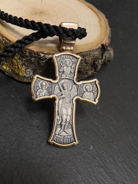 На центральной части креста изображено распятие Исуса Христа,на ушке изображен огненный Серафим. На оборотной стороне креста изображены св. Серафим Саровский,св.Николай Чудотворец, СВ. КН. Александр Невский,Архангел Михаил.