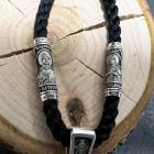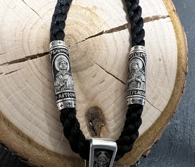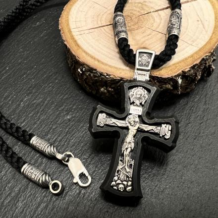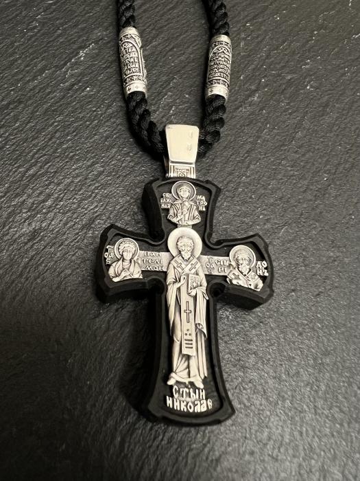 Православный нательный крест из эбенового дерева с серебряными вставками на шнурке. Эбен является ценной породой древесины, обладает плотной структурой и отличными водооталкивающими свойствами. Дополнительно крест пропитан натуральным маслом, которое при высыхание полимеризуется, что делает изделие более долговечным. На лицевой стороне крестика расположено Распятие Иисуса Христа из серебра 925 пробы. На оборотной стороне размещены образы наиболее почитамымых святых - Николая Чудотворца, Великомученника Пантелеймона, Спиридона Тримифунтского и Матушки Матроны.