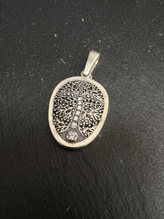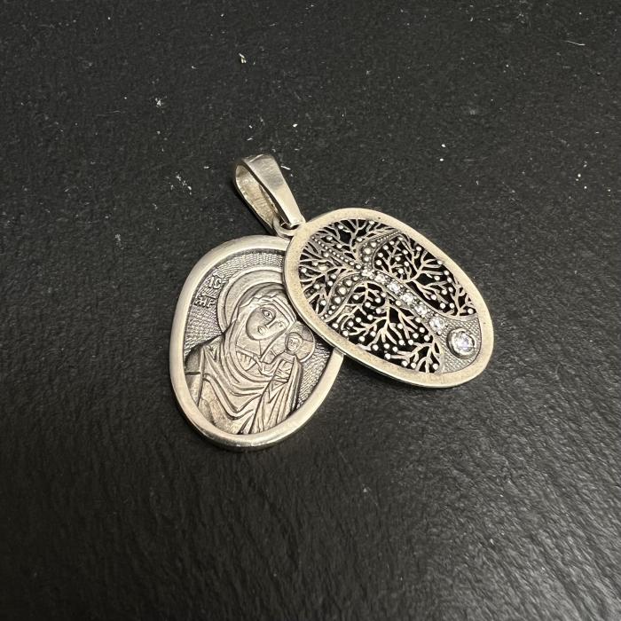 Верхняя часть подвески представляет собой изысканное ажурное "Древо Жизни", символизирующее связь между небом и землей, мудрость, долголетие и процветание. Выполненная с особой тщательностью, она украшена сверкающими фианитами, которые придают изделию дополнительный блеск и элегантность. Каждый фианит нежно мерцает на свету, подчеркивая утонченный дизайн и создавая ощущение легкости. На нижней части подвески - Богородица Казанская, одна из самых почитаемых икон в православной традиции. Этот образ олицетворяет защиту, надежду и материнскую заботу. Он служит источником духовной силы и утешения для всех, кто носит этот кулон.
