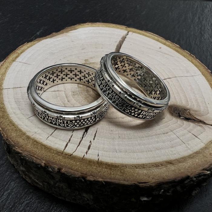 Православное кольцо с молитвой "Душевный покой". На серебряном кольце нанесена молитва на церковно-славянском языке. Крутящийся элемент на основном кольце - главная особенность данного изделия. Церковное кольцо принято считать не просто оригинальным ювелирным украшением, а истинной защитой верующего человека. Это символ христианской веры.