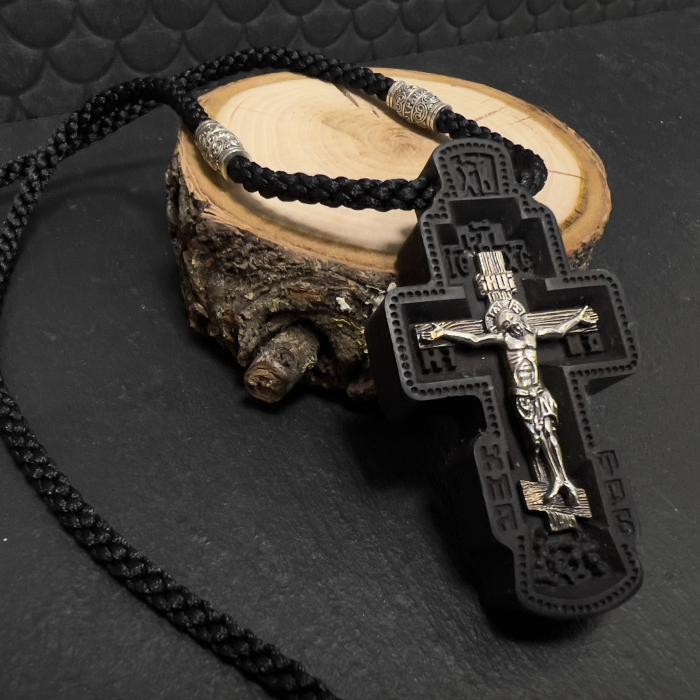Крест укомплектован накладками из серебра 925 пробы. На лицевой стороне креста расположено Распятие. На оборотной стороне Архангел Михаил