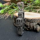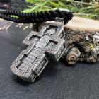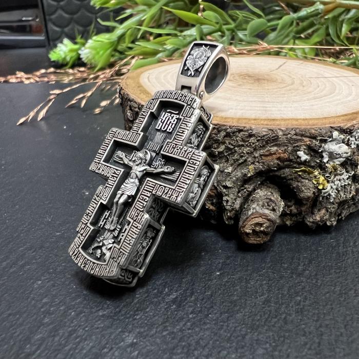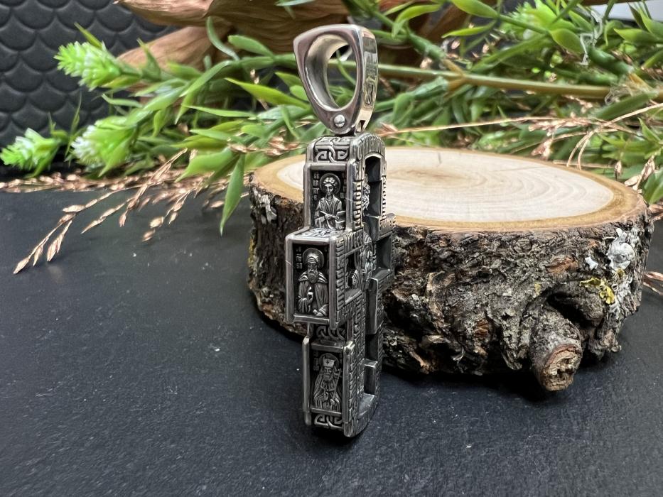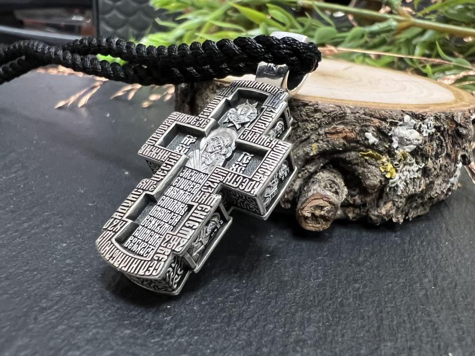 Крест серебряный,нательный,православный. Крест на шее – символ бесконечной веры, оружие спасения христианина, постоянная защита Божия. В далеком прошлом старец Савва говорил: " - Христианин без креста, — словно солдат без оружия, поэтому любой неприятель может легко одолеть его", а ношение нательного креста, обеспечивает постоянную защиту Божию. На лицевой стороне креста изображено распятие Иисуса Христа, по рамке пущено начало молитвы "Да воскреснет Бог". На оборотной стороне изображен Серафим шестикрылый и образ Казанской иконы Божией Матери,по рамке пущена выдержка из Тропаря. По правую руку от Иисуса Христа на торце креста изображены- св.Матрона Московская,св.Николай Чудотворец, св.Спиридон Тримифунтский. По левую руку на торце изображены- св.Великомученик Пантелеимон, св.Сергий Радонежский, св.Лука Крымский.