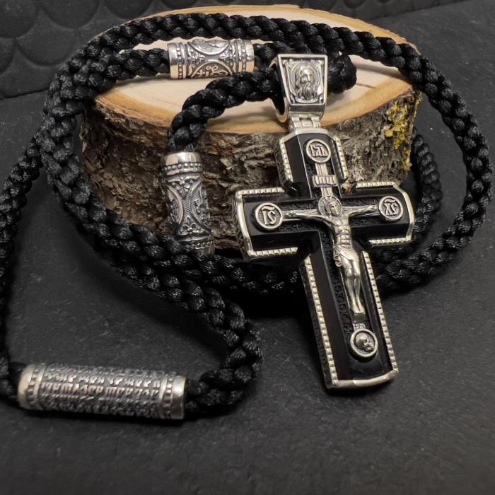 Oбратная сторона: в центре - молитва спаси и сохрани и виноградная лоза ,православный орнамент по бокам . На ушке - Харизма. Торцевая сторона -молитва (огради мя господи силою честнаго и животворящего твоего креста) Замок- Молитва- Отче наш. Вставка выполнена из ДПК(древесно-полимерный композит) Состав: измельчённое эбеновое дерево 70% + полимер 30%.