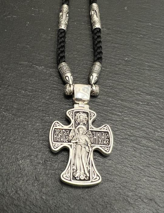 На гайтане расположено 6 серебряных вставок с изображением 12 Апостолов. Гайтан изготовлен из высококачественного полиэфирного шёлка. Он не окрашивает, не выцветает, гипоаллергенный, не деформируется, не ворсится, долговечен. На лицевой стороне креста изображено Распятие Господа Иисуса Христа. На обороте — образ Архангела Михаила. Могучий Архангел почитается как защитник человека от злых сил и покровитель воинов. Архистратиг Небесного воинства ведет непримиримую войну против сил зла, охраняет райские врата и защищает души умерших.