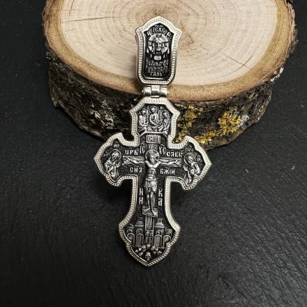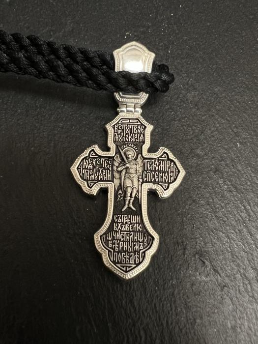 Серебряный крест с изображением Архангела Михаила — это не просто ювелирное украшение, а символ веры, силы и мужества, выполненный с высочайшим мастерством. Он станет личным символом духовной опоры и достойным подарком как проявление заботы и любви. В центре композиции — фигура Иисуса Христа, окруженная иконами Пресвятой Богородицы, Святого Пророка Иоанна Предтечи и Святой Троицы. На створке ушка изображён Спас Нерукотворный, а на оборотной стороне — Архангел Михаил, небесный воин, побеждающий зло, с молитвой: «Кресту Твоему поклоняемся, Христе, Честному Хранителю мира».